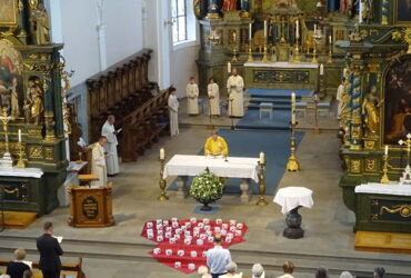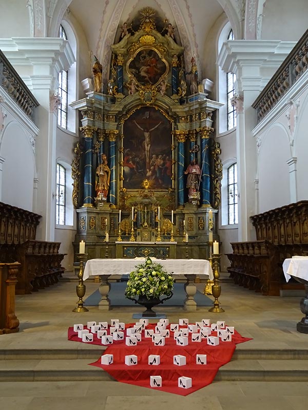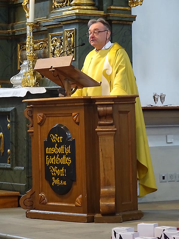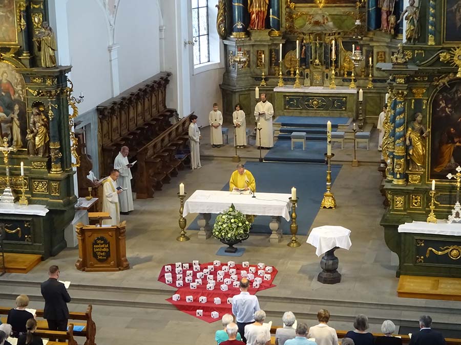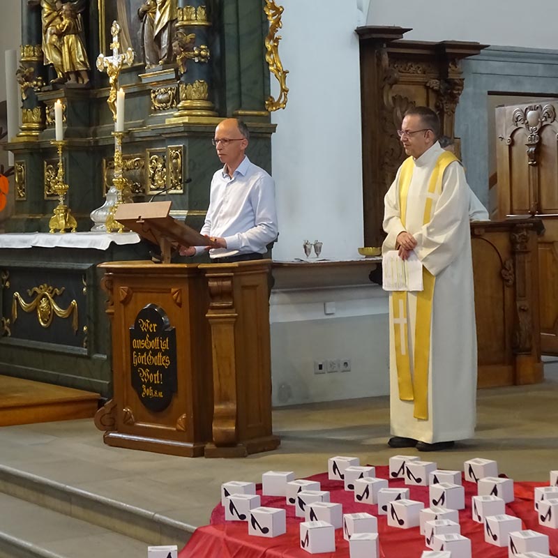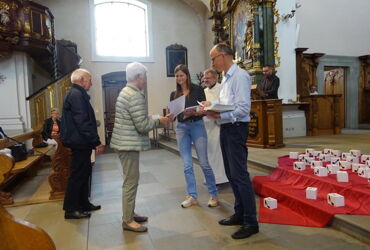 Höhepunkt des Ehrungstags war dann der Gottesdienst in der wunderschönen barocken Lachener Kirche. Es war ein besonderes Glück, dass diese Feier noch möglich war einige Wochen bevor die Kirche wegen Renovierungsarbeiten für mehrere Monate geschlossen wird. Der Eucharistie stand der Generalvikar der Urschweiz, Bernhard Willi vor, und auch der Ortspfarrer Beat Häfliger feierte mit uns. Eine besondere Freude war, dass der Lachener Kirchenchor Cäcilia unter der Leitung von Florian Moskopf den Gottesdienst mitgestaltete. In seiner Predigt ermutigte der Generalvikar die Mitfeiernden, sich – wie beim Chorsingen –auch in der Kirche mit der je eigenen Stimme einzubringen, die gehört werden soll und muss. Alle sollen auf den Weg mitgenommen werden, «in welche Richtung es auch gehen wird, das meint auch das Verständnis von synodaler Kirche».