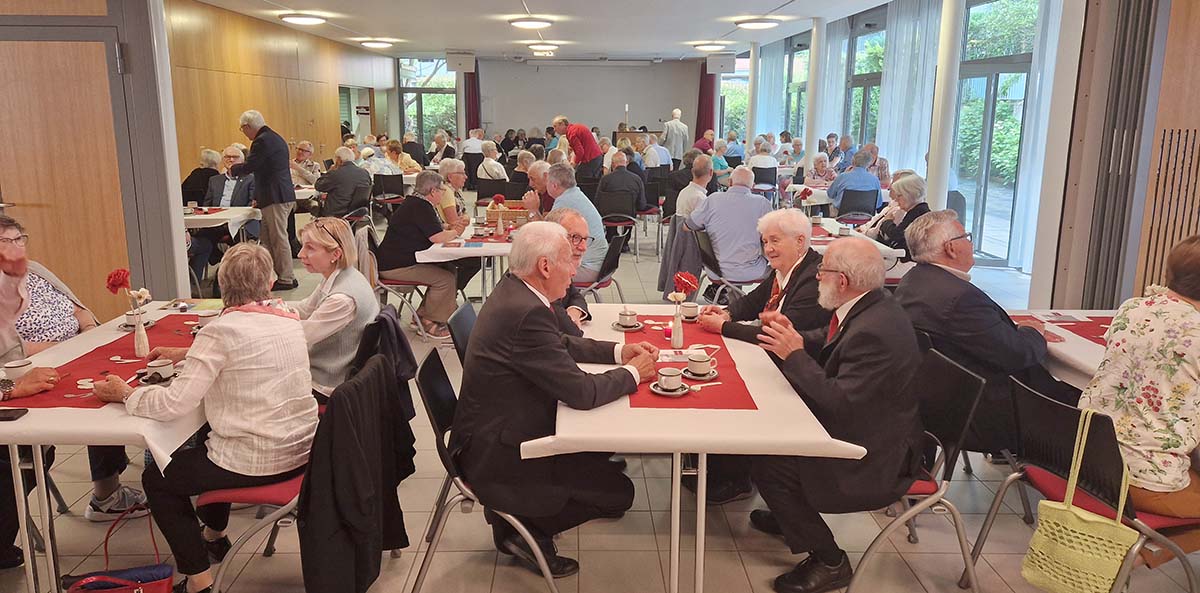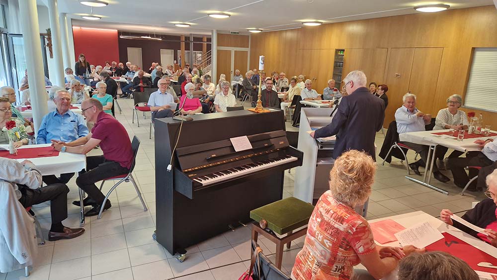 Es ist eine schöne Tradition, dass altgediente in der Kirchenmusik Engagierte vom Kirchenmusikverband Bistum Chur alle fünf Jahre mit einem besonders gestalteten Tag geehrt werden. Dieser Ehrungstag fand am Samstag, den 8. Juni, in Lachen SZ statt. Eingeladen waren alle, die mindestens 50 Jahre in der Kirchenmusik, insbesondere als Chorsängerinnen und Chorsänger aktiv sind. So reisten 48 Frauen und Männer aus dem ganzen Bistum an. Mit entsprechender Begleitung konnten der Präsident des KMV Bistum Chur Udo Zimmermann und der Präses Martin Conrad im Pfarreizentrum Lachen rund 90 Personen begrüssen. Soviel versammelte Erfahrung und Fachkompetenz nutzten Udo Zimmermann und Martin Hobi, um vom Projekt «Jubilate» zu berichten, also den Arbeiten an den neuen Medien, die in einigen Jahren das katholische Gebet- und Gesangbuch ablösen sollen. Es wurde nicht nur berichtet, sondern auch Einblick in die Arbeit der Redaktion gewährt, und in einem kleinen Workshop konnten die Teilnehmenden selbst ihre Stimme abgeben für verschiedene Kirchenlieder, die vorher gemeinsam gesungen wurden und bei denen noch nicht eindeutig klar ist, ob oder in welcher Form sie Aufnahme in das neue «Jubilate» finden.